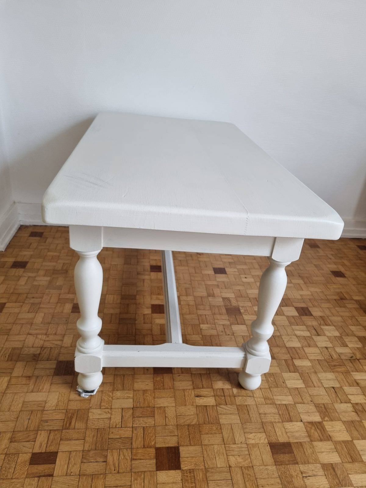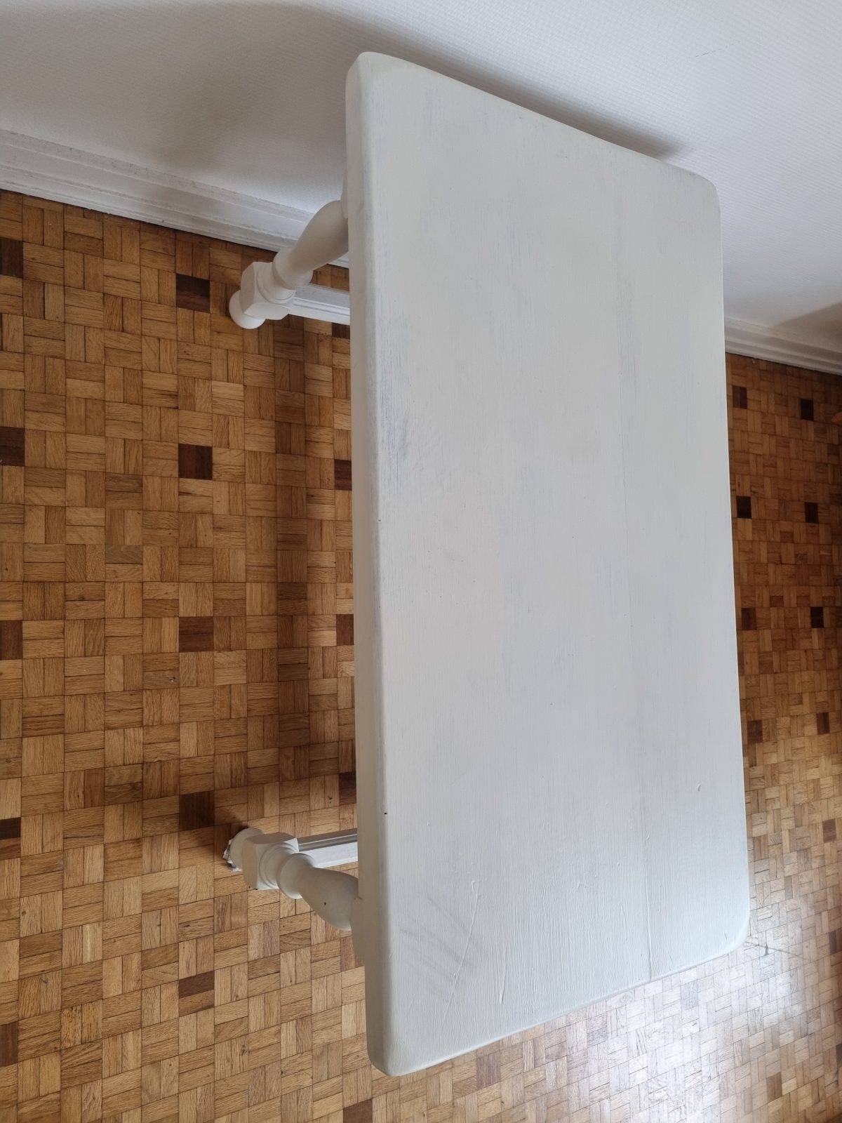 Donne petite table basse de salon blanche. En bois. Quelques taches sur le dessus mais bon état. Légèrement voilée.