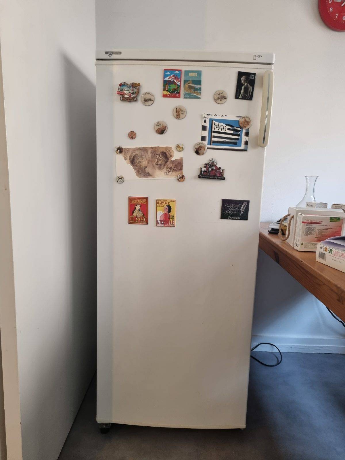Donne frigo avec congélateur en bon état. Un peu abîmé sur le devant et porte du congélateur qui ferme à l’aide d’une calle. Magnet non inclus